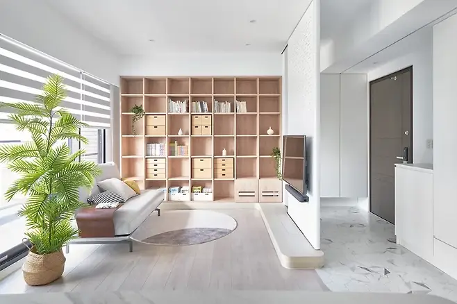 백라이트가 비추는 양면 TV 벽 아래, 부드럽고 원목 질감의 책장이 자연스럽게 펼쳐진다. 이 공간은 단순한 거실을 넘어선다.