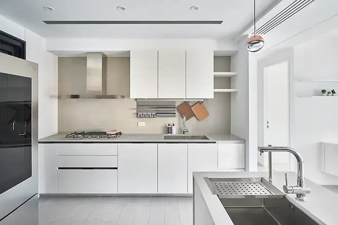 알루미늄 프레임의 무지갯빛 유리문은 주방을 살짝 가리면서도 소통의 창구를 확장한다. L자형 아일랜드와 흰색-목재 조리대는 시각적으로 넓고 활동적으로 보이게 한다.