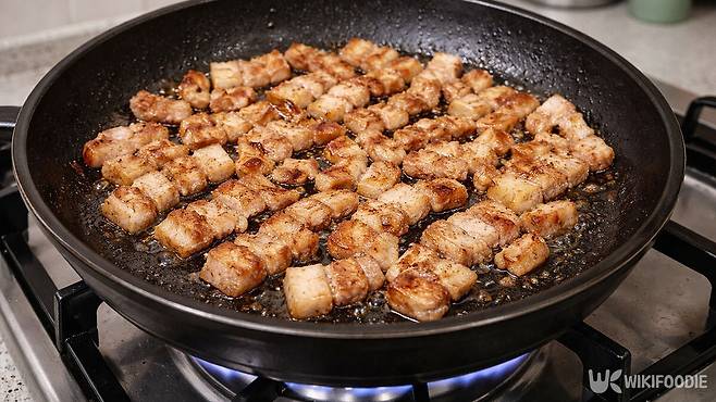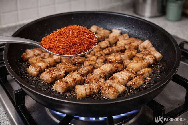 삼겹살에서 기름이 충분히 나오면 불을 약하게 줄인다. 팬 한쪽에 고춧가루 1큰술을 넣고 고기 기름과 섞는다. 불이 세면 고춧가루가 금방 타서 쓴맛이 나므로 반드시 낮은 온도를 유지해야 한다. 고기 기름에 고춧가루 향이 녹아들며 붉은 빛깔이 돌기 시작한다.
