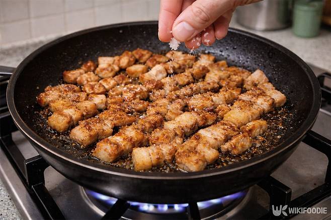 팬을 뜨겁게 달군 뒤 고기를 올린다. 이때 바로 뒤집지 않는 것이 핵심이다. 약 3분간 그대로 두어 고기 표면이 갈색으로 변하며 고소한 향이 날 때까지 기다린다. 이를 통해 고기 본연의 풍미가 살아난다. 한 면이 노릇해지면 뒤집어 반대편도 2분 이상 충분히 굽는다. 소금은 간이 살짝 배도록 소량만 뿌린다.