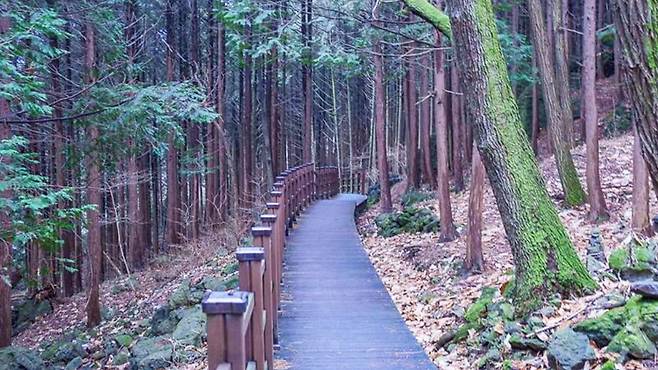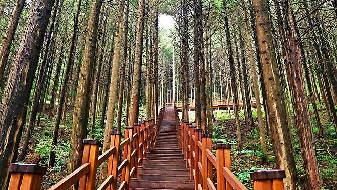빽빽하게 들어선 나무들 사이로 시원한 그늘이 드리우고, 그 아래를 따라 약 500m 길이의 데크 산책로가 이어진다.