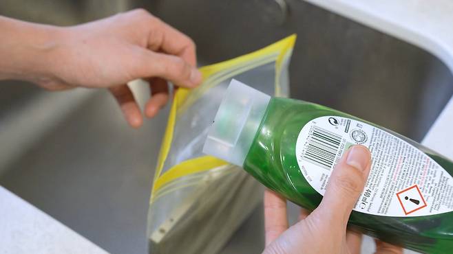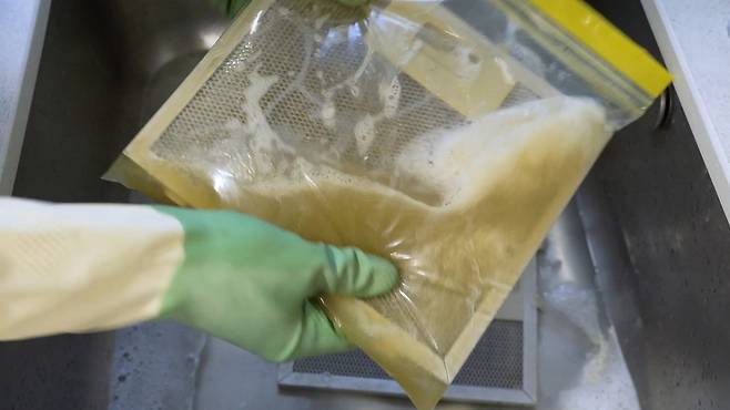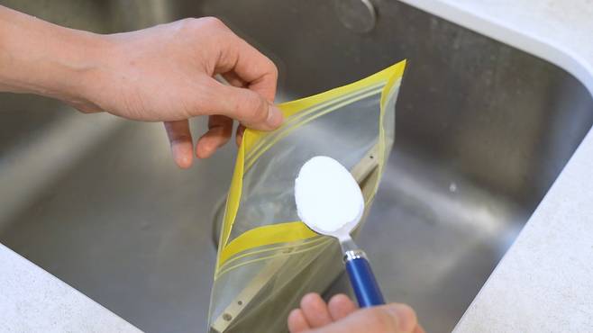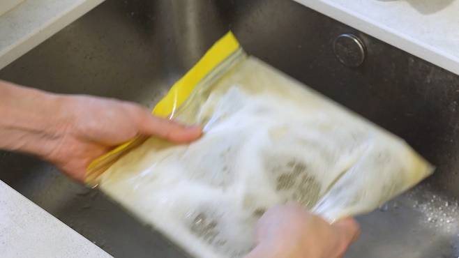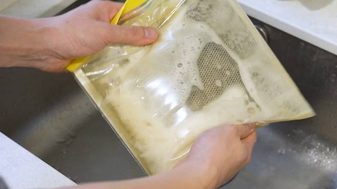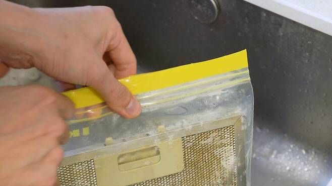 이후 지퍼백을 잡은 후 마구 흔들어 주세요. 그러면 뜨거운과 세제가 만나 주방후드 필터에 낀 기름때를 아주 말끔하게 녹여 준답니다.