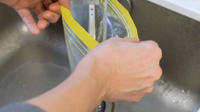 이후 물이 새지 않도록 지퍼를 꼭 닫아 주세요. 그리고 남은 공기도 모두 빼서 닫는 것이 좋아요. 뜨거운 물이 들어갔기 때문에 지퍼가 부풀어 오를 수 있어요.