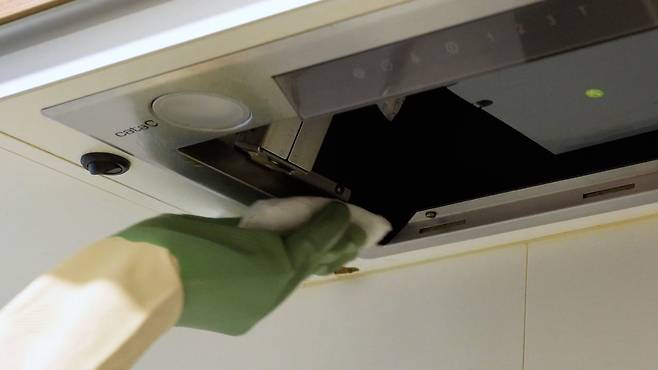 필터를 끼기 전 주변 청소도 중요한데요. 그릇에 따듯한 물과 베이킹소다를 섞은 후 키친타월에 적셔 주세요. 그리고 주변을 키친타월로 문질러 닦아 줍니다. 그러면 베이킹소다 물이 기름때를 녹여 아주 쉽게 기름때 세척이 가능해요.