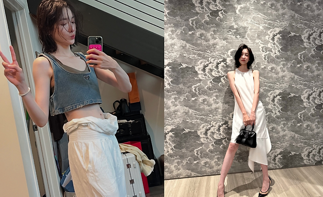 두 번째 사진에서는 데님 크롭탑으로 완전히 다른 매력을 선보이고 있다. 삼각형 로고가 포인트인 크롭탑과 화이트 하의의 조합으로 스포티하면서도 여성스러운 룩을 연출하고 있다. 젖은 헤어 스타일링과 함께 자연스러운 브이 포즈로 활기찬 에너지를 표현하고 있다.