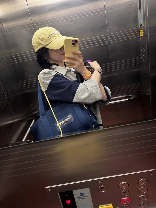 옐로우 캡과 네이비 재킷의 조합으로 활동적인 스트릿 스타일을 연출하고 있다. 블루 숄더백을 매치해 컬러 포인트를 주었으며, 엘리베이터 안에서의 자연스러운 셀피로 일상적이면서도 트렌디한 매력을 보여주고 있다.