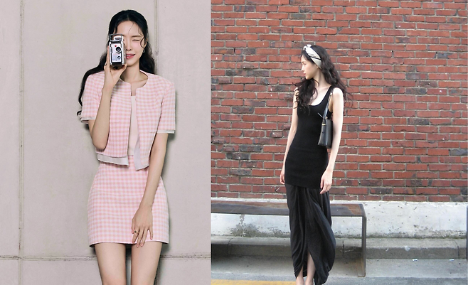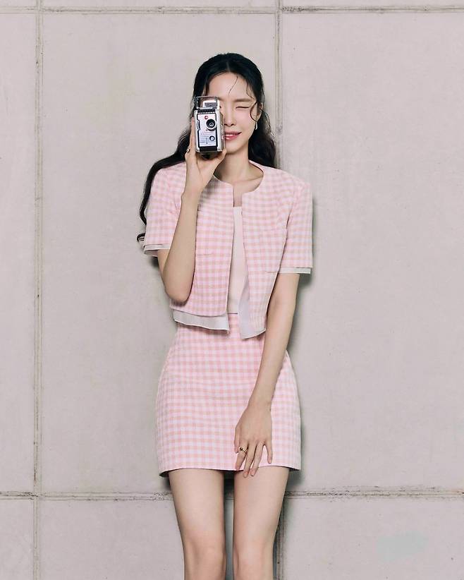 손나은이 사랑스러운 핑크 체크 패턴 투피스로 청순한 매력을 발산하고 있다. 크롭 재킷과 미니스커트의 조합으로 트렌디한 세트 룩을 완성했으며, 빈티지 카메라를 소품으로 활용해 레트로 감성을 더했다. 화이트 트리밍 디테일이 깔끔한 포인트를 주고 있다.