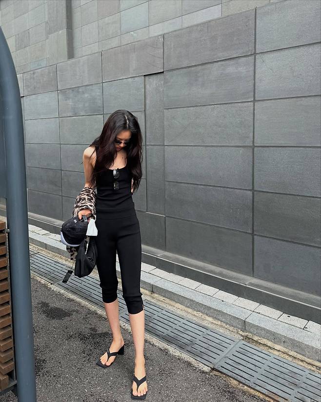 손나은이 회색 석재 벽면을 배경으로 세련된 올블랙 코디네이션을 연출하고 있다. 검은색 미니 드레스에 레오파드 패턴의 가디건을 매치해 도시적이면서도 힙한 분위기를 완성했다. 블랙 선글라스와 미니 핸드백으로 포인트를 주어 모던한 시크함을 강조하고 있다. 심플한 플랫 샌들로 편안함과 스타일을 동시에 잡은 것이 인상적이다.