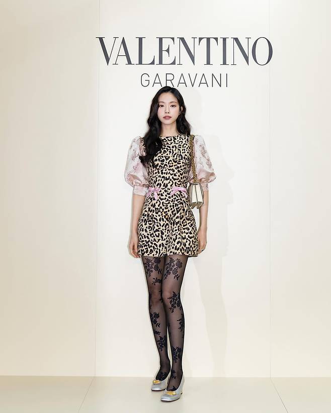 발렌티노 행사장에서 손나은이 대담한 레오파드 패턴 드레스로 시선을 사로잡고 있다. 시스루 소재의 볼륨 있는 슬리브가 로맨틱한 디테일을 더하며, 레이스 스타킹과 실버 펌프스로 럭셔리한 완성도를 보여준다. 핑크 벨트로 허리 라인을 강조해 여성스러운 실루엣을 연출하고 있다.