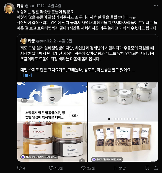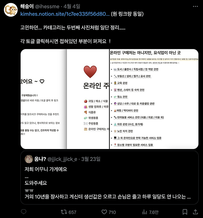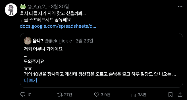 트위터의 큰 장점인 ‘빠른 확산’을 활용하여 선한 영향력을 끼치는 사람들도 나타났다. 꼭 가족이 아니더라도, 자신이 알바했던 가게나 평소 좋아하던 가게의 사장님이 힘들어하시는 것 같다며 글을 올린 것.