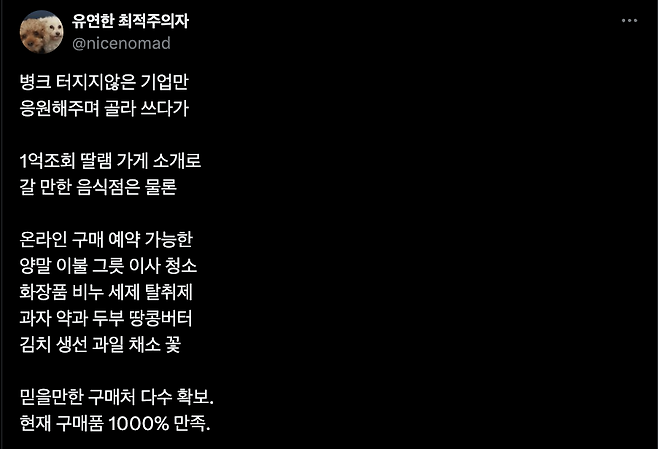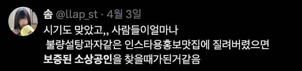 아래 트윗처럼 인스타나 블로그 심지어 트위터마저도 바이럴 글로 잠식되었기 때문에, 그럴듯해 보이는 인스타 맛집이 아닌, 실패하지 않을 ‘진짜 맛집’에 대한 갈증이 컸다는 것을 알 수 있다.