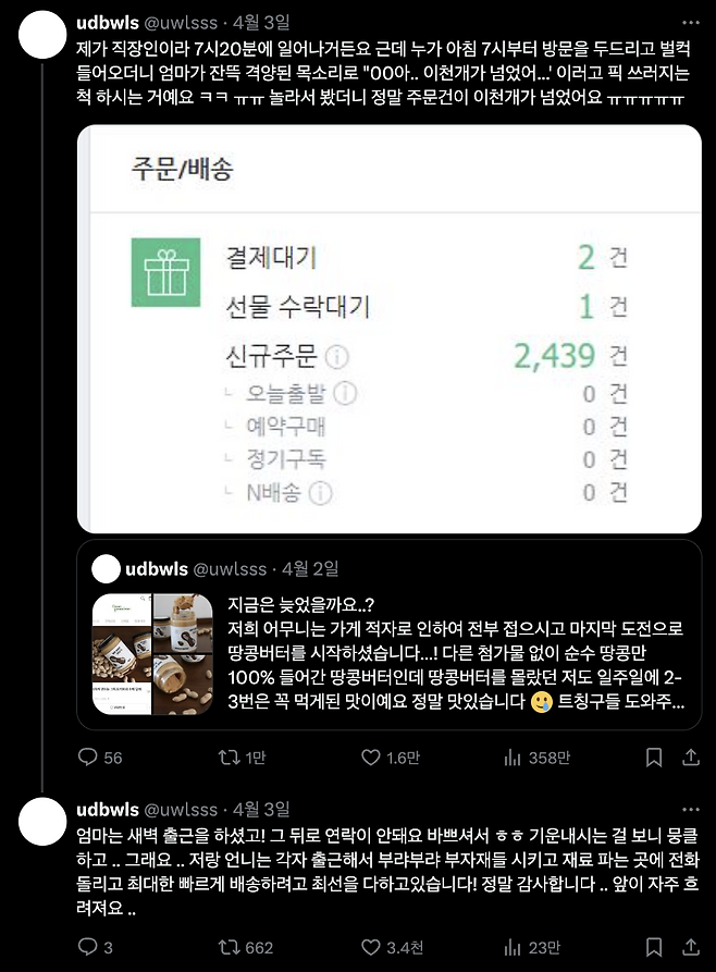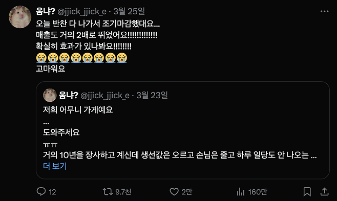 이런. 이 글을 쓰고 있는 사이, 1.6억 조회수를 돌파하였다. 실제로 3월 25일에는 원글 작성자가 매출이 거의 2배로 뛰었다는 소식을 전해주기도 했다.