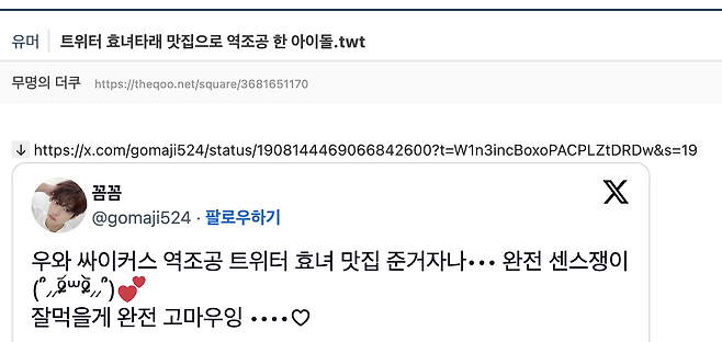 이미지 = 더쿠 유머 게시판 “트위터 효녀타래 맛집으로 역조공 한 아이돌.twt” 중 일부 및 댓글 캡처 (https://theqoo.net/square/3681651170)