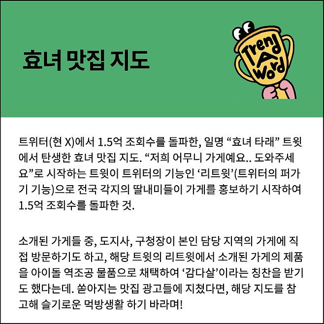 트집쟁이들, 안녕! 수습 에디터 빤히다. 첫 인사를 올린다. 오늘은 ‘맛집 디깅에 진심인 트집쟁이들’이라면 이미 알고 있을 수도 있는 “트위터 효녀 맛집 지도”를 가져와 봤다. 슬슬 인스타그램이나 블로그 등으로도 퍼지고 있는 것 같아 소개해 보려 한다.