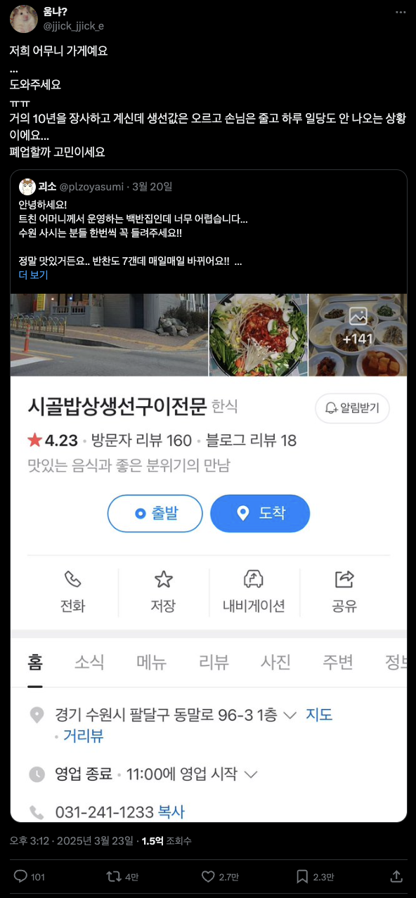 트위터의 큰 장점인 ‘빠른 확산’을 활용하여 선한 영향력을 끼치는 사람들도 나타났다. 꼭 가족이 아니더라도, 자신이 알바했던 가게나 평소 좋아하던 가게의 사장님이 힘들어하시는 것 같다며 글을 올린 것.