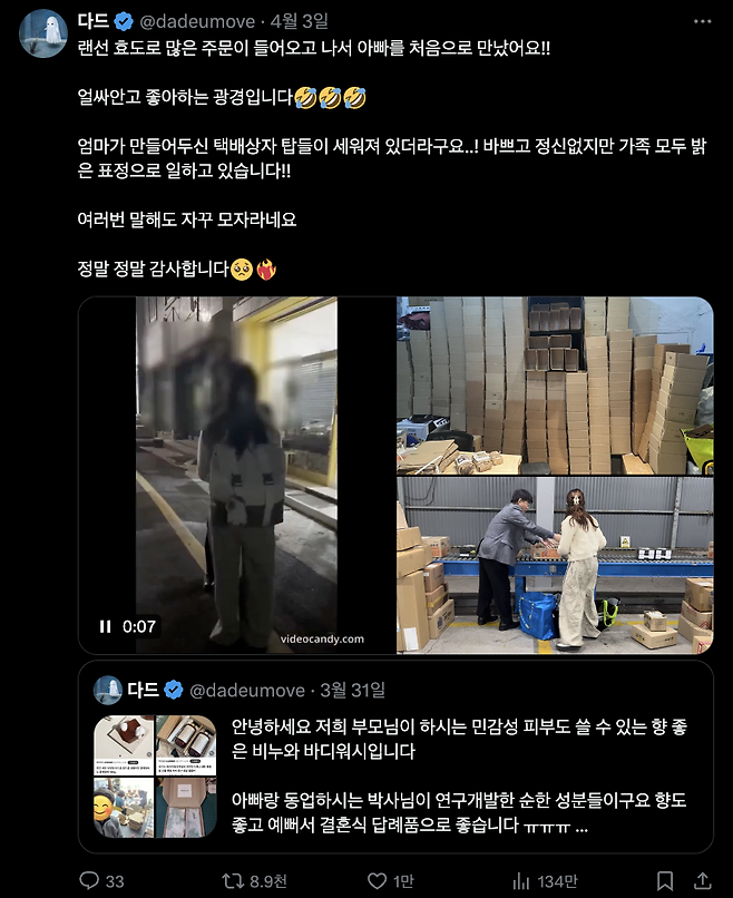 이런. 이 글을 쓰고 있는 사이, 1.6억 조회수를 돌파하였다. 실제로 3월 25일에는 원글 작성자가 매출이 거의 2배로 뛰었다는 소식을 전해주기도 했다.