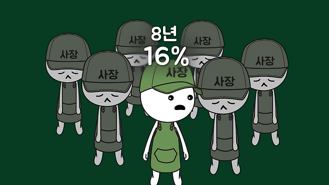 그런데 이 비율을 더 깊게 들여다보면 매년 100만 명이 창업하고 있음에도 비율이 유지되는 상황입니다. 이 말은, 그만큼 많은 자영업자가 사업을 오래 이어가지 못한다는 뜻으로 통계에 따르면 1년 생존율은 약 78%, 3년은 약 54%, 5년은 약 40%, 8년은 약 16% 수준에 불과하다고 합니다.