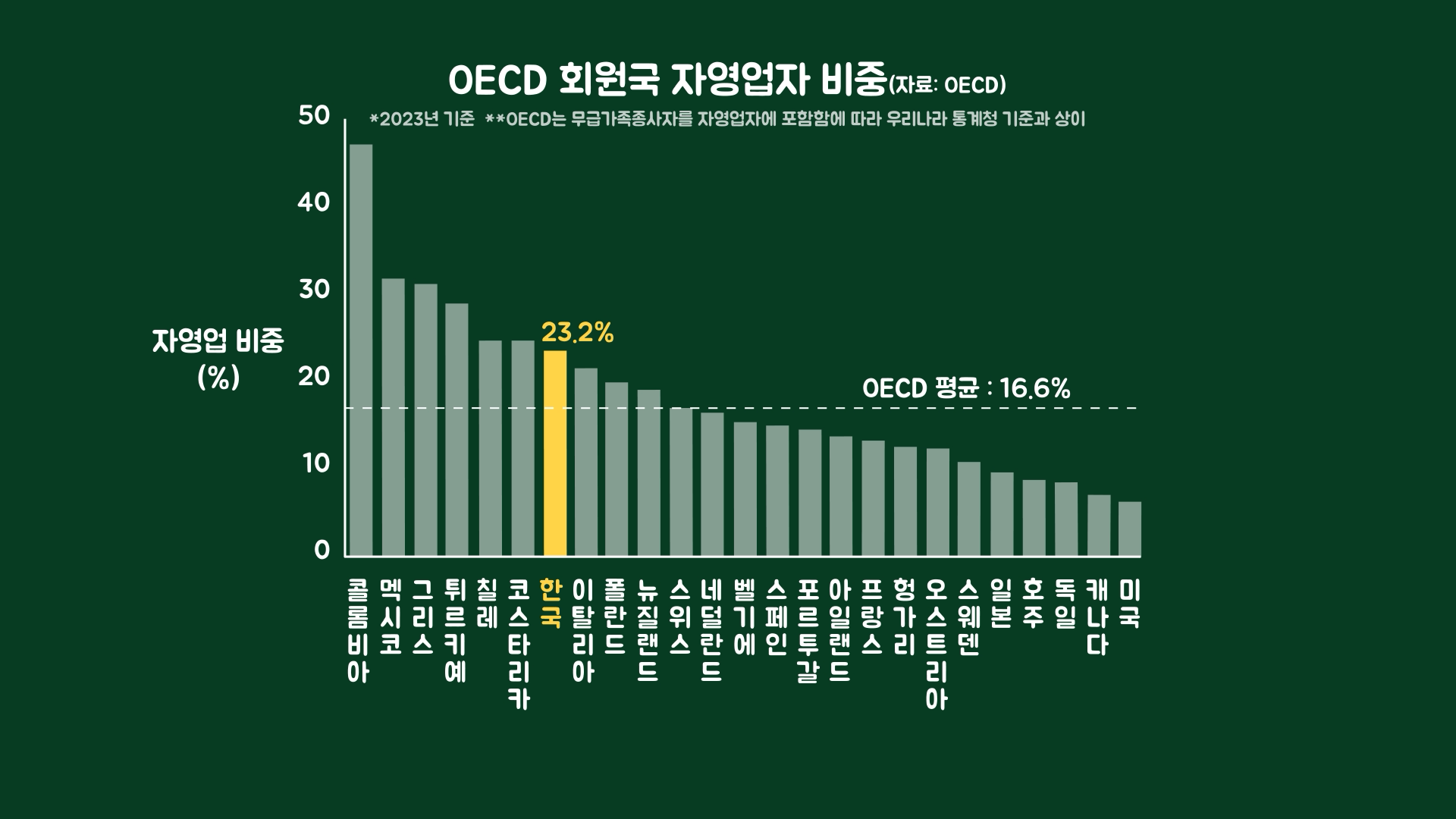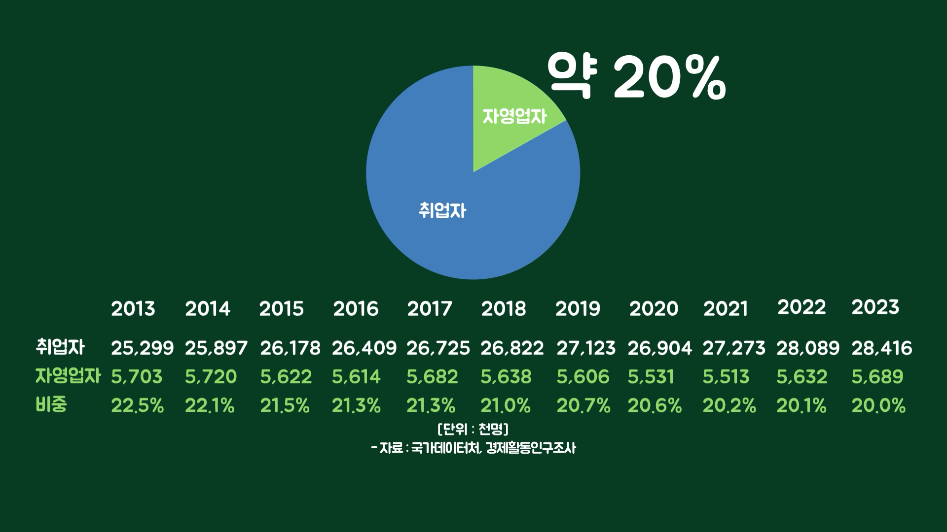 우리나라의 전체 경제활동 인구 중 자영업자의 비중은 약 20% 정도인데, OECD 통계와 비교해 봤을 때 경제 규모 대비 비중이 상당히 높은 편입니다.