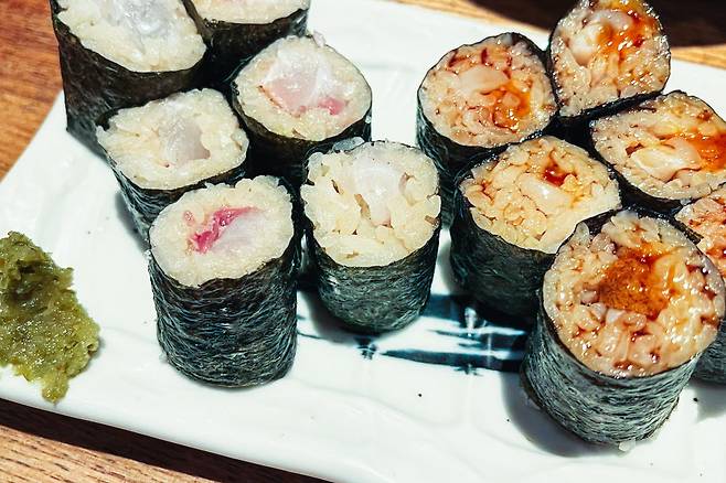 참고로 이곳 오뎅인 겨자보다 유즈코소에 찍어 먹는 게 맛있다. 유즈코쇼는 청유자껍질, 고추, 소금으로 만드는 규슈 지방 음식인데, 상큼하면서도 매콤하게 톡 쏘는 맛이 일품이다. 개인적으로 진린의 하이라이트는 '마키(재료와 밥을 넣고 김에 돌돌만 음식)'다. 대체로 가격도 합리적이라서 부담이 없다. 가장 추천하는 마키는 도미와 성게 페이스트가 올라간 마키. 이 역시 유자코쇼와 함께 곁들이면 극락이 따로 없다.