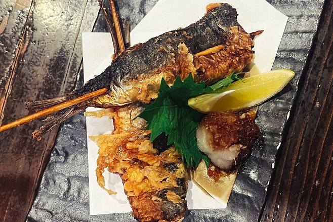 다음으로는 전갱이 튀김을 추천한다. 전갱이 튀김은 수이카의 명물이다. 내장이 잘 손질된 전갱이 안에 우메보시(매실 장아찌)와 시소잎을 가득 채워 빠르게 튀겨낸다. 머리부터 한 입 베어 물면 튀김이라 생각하지 못할 정도로 부드러운 전갱이의 식감을 느낄 수 있다. 시소와 우메보시의 짭짤하고 상쾌한 맛도 일품이다. 하이볼이나 레몬사와 같이 청량한 페어링을 추천한다. 전갱이는 먹을 때는 좋은데, 먹고 나서 나는 특유의 냄새가 문제이기 때문이다.