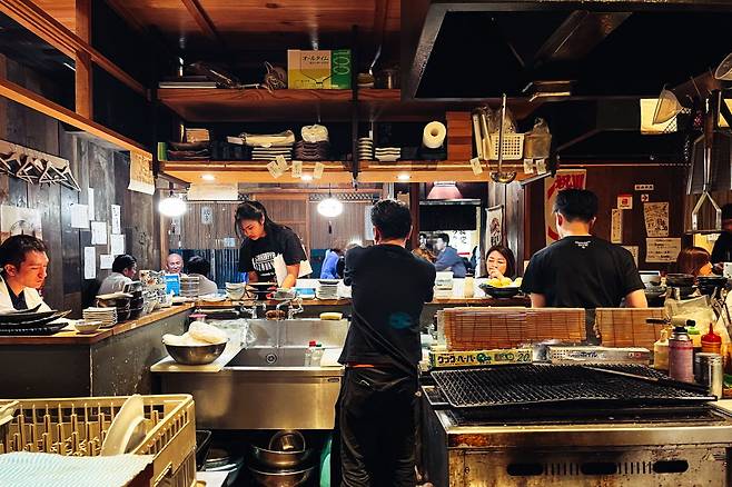 이자카야를 큰 분류로 나누면 2개로 나뉜다. 오순도순 모여 소곤거리며 대화할 수 있는 곳, 그리고 종업원부터 손님까지 고래고래 소리 지르며 왁자지껄 노는 곳. 텐진에 위치한 '진린'은 후자에 속하는 이자카야다. 그야말로 에너지가 넘쳐 흐르는, 후쿠오카 텐진의 젊은 피들이 이끄는 이자카야. 매장 한가운데 오픈형 주방이 자리하고 있어 음식하는 모습을 바라볼 수 있다.