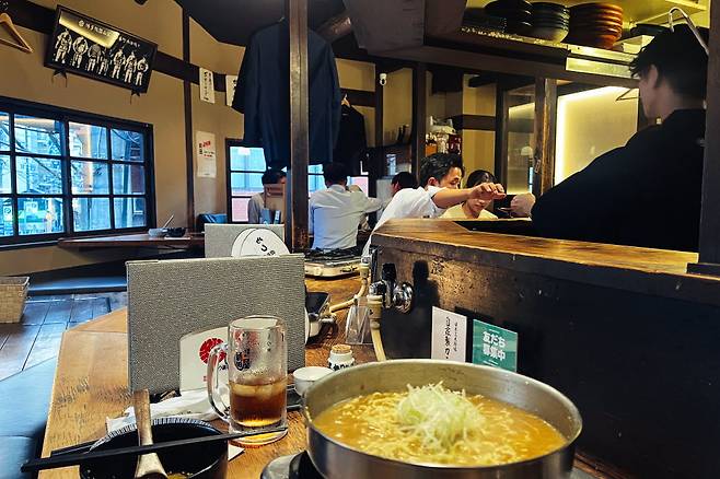 마에다야 모츠나베는 후쿠오카 내에 여러 지점이 있다. 그중 가장 '이자카야' 같은 분위기를 뽐내는 곳이 다이묘점이다. 성인 키보다 살짝 작은 문으로 들어서면 거의 90도에 가까운 계단이 등장한다. 그 계단을 타고 2층으로 올라가면 20명 남짓 들어가는 자그마한 공간의 메다야 모츠나베 다이묘점이 등장한다.