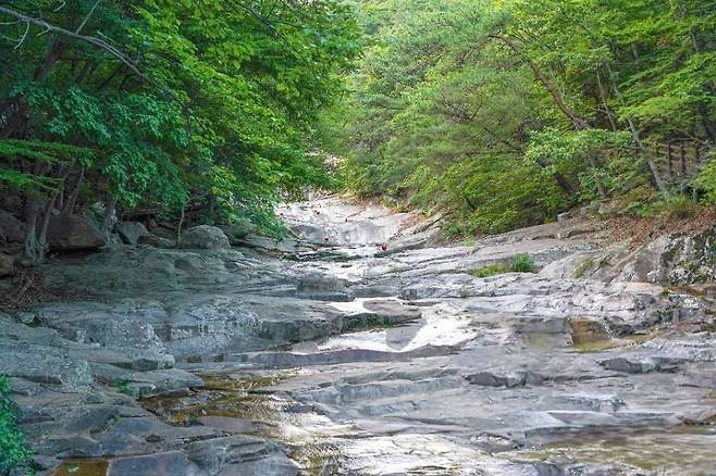 특히 주목할 만한 것은 오천 평 반석이다. 넓은 화강암 반석이 마치 자연이 만든 거대한 광장처럼 펼쳐져 있으며, 그 면적이 무려 5,000평에 달한다고 하여 ‘오천평반석’으로 이름 붙여졌다.