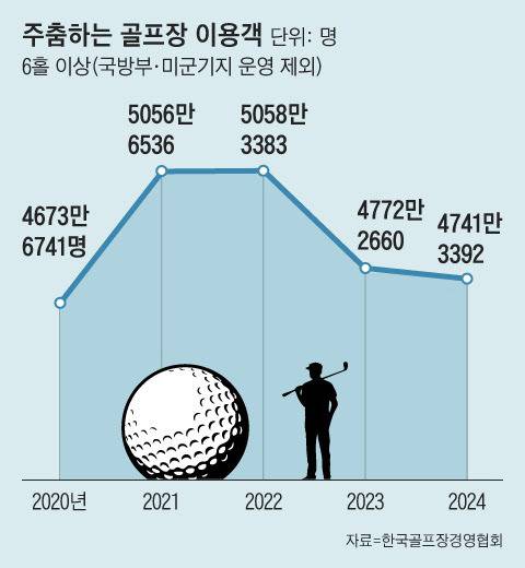한국골프장경영협회에 따르면 지난해 1월 1일부터 12월 31일까지 전국 524개 골프장에 4741만 3392명이 다녀간 것으로 조사됐다. 이는 전년 같은 기간 4772만2660명에 비해 0.6%인 약 31만명 줄어든 수치다. 지역별로는 제주도가 가장 큰 타격을 받은 것으로 드러났다. 제주도 골프장은 2023년 1홀당 내장객이 3300명에서 지난해 3069명으로 7% 줄어들었다.