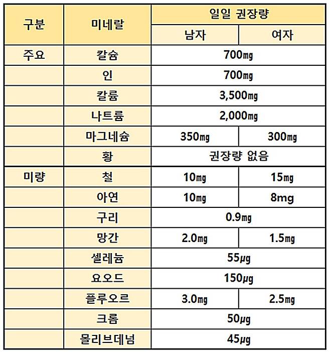 따라서 체내에서 비교적 많은 양을 필요로 하는 미네랄, 그리고 우리나라 성인들에게 있어 섭취량이 부족한 편에 속하는 미네랄을 위주로 소개하고자 한다.