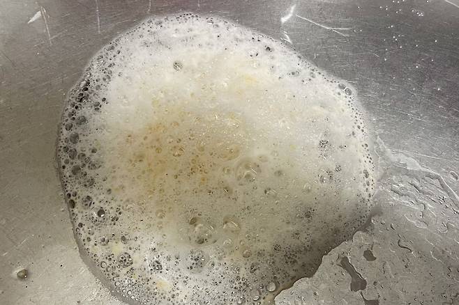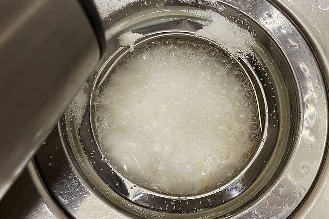뜨거운 물을 천천히 부어주면 물이 빠져나가지 않으니 거품이 뽀글뽀글 생기면서 올라와요. 꼭 환기하면서 작업하세요.