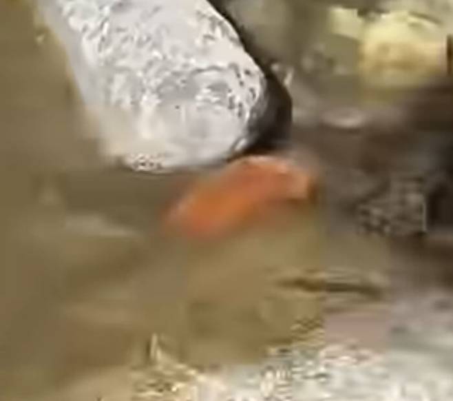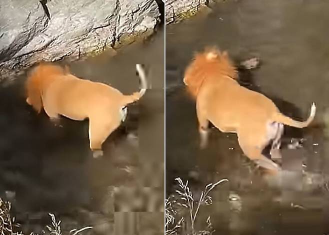 타겟은 바로 물결을 따라 떠내려오던 커다란 나뭇가지였는데요. 사자는 먹잇감을 놓치지 않겠다는 듯 힘차게 점프해 나뭇가지를 꽉 물었습니다.