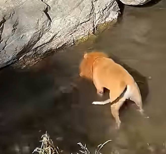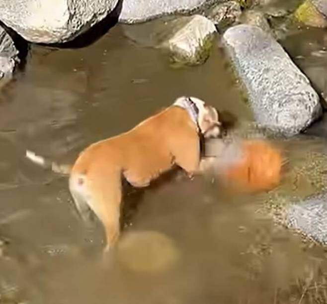 가발이 떠내려가 버려 조금은 시무룩해진 모습이었지만 강아지는 이내 본래의 모습으로 돌아와 시원한 물놀이를 즐겼습니다.