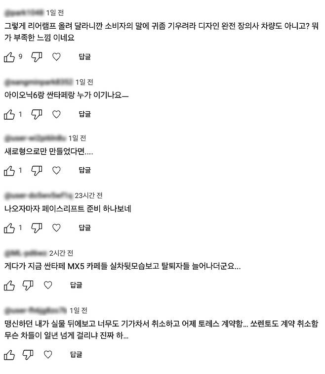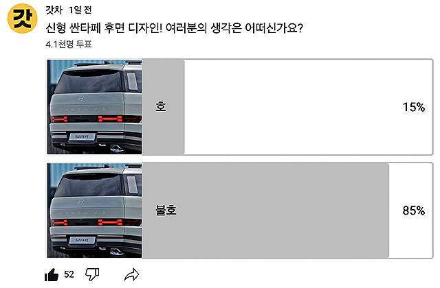 [신차 갤러리] 현대차의 야심작, 싼타페 풀체인지(5세대, 코드명 MX5) 공개 이후, 후면디자인에 대한 논쟁이 뜨겁습니다. 실제로 '갓차 유튜브 커뮤니티'에서 약 하루동안 진행된 투표에서는 4,000여명이 참여하여 85%가까운 이들이 신형 싼타페 후면 디자인에 대해 '불호'를 표시하였는데요.