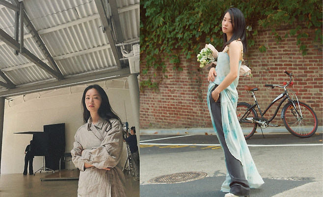 전통 한복의 실루엣을 현대적으로 재해석한 민트 컬러 드레스로 독특한 매력을 발산하고 있다. 화이트 꽃다발을 든 채 거리에서 촬영한 이 룩은 전통미와 모던함이 조화를 이루며, 자전거가 있는 배경과 어우러져 일상 속 특별함을 연출하고 있다.