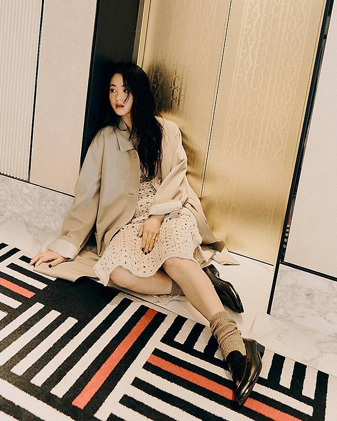 전여빈은 베이지 컬러의 오버사이즈 블레이저와 플로럴 패턴의 미디 드레스를 매치하여 세련된 레이어드 스타일을 연출하고 있다. 니트 삭스와 로퍼를 조합한 발끝 스타일링으로 캐주얼함과 우아함을 동시에 표현했다. 기하학적 패턴의 러그 위에서 포즈를 취한 모습이 모던한 감각을 더하고 있다.
