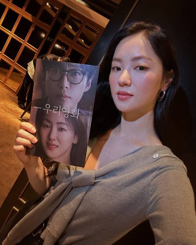 부드러운 그레이 컬러의 니트 원피스로 따뜻하고 편안한 무드를 연출하고 있다. 오프숄더 디자인이 여성스러운 매력을 강조하며, 영화 포스터를 든 모습에서 자연스러운 일상의 순간을 포착한 듯한 편안함이 돋보인다.