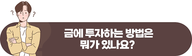 실물로 금에 투자하는 방법은 골드바 매입, 골드 뱅킹, KRX 금시장을 이용하는 것이 있습니다. 그리고, 금융상품으로 투자하는 방법은 펀드와 주식의 장점을 모은 다양한 금 ETF 상품이 있습니다. 마지막으로 금 관련 기업의 주식에 투자하는 방법이 있습니다.