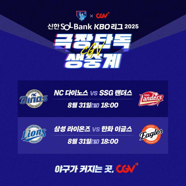 CGV는 오는 31일 오후 6시에 열리는 'NC 다이노스 vs SSG 랜더스' 경기와 '삼성 라이온즈 vs 한화 이글스' 경기를 생중계한다.