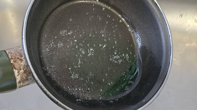 👉 소금의 스크럽 효과로 미세한 칼자국 사이의 찌든 때 제거