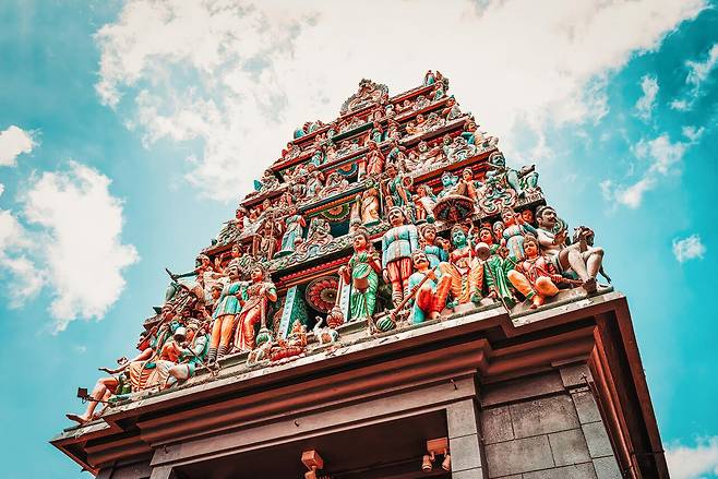 싱가포르에는 질병을 치료하는 여신 ‘마리암만’을 위한 축제가 열리는 가장 오래된 힌두교 사원이 위치해 있는데요. 15m 높이의 화려함을 자랑하는 ‘고푸람’의 모습은, 힌두교와 관련된 다채로운 색감의 조형물들을 뽐내기에 부족함이 없죠. 여러 힌두신과 소, 뱀 등의 신성한 동물 조각으로 가득한 외관은 살짝 섬뜩하기까지 합니다.