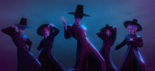 그리고 사자보이즈. 블랙 앤 골드 컬러에 금박 자수, 체인, 스트랩까지. 딱 요즘 힙합 퍼포먼스 팀 무대룩 같죠.