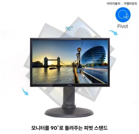 모니터 스탠드 자체에 모니터를 세로로 돌릴 수 있는 기능이 포함된 제품을 구매하는 방법이 있습니다. 이 기능은 피벗(Pivot)기능이라 하는데, 보통 고가의 모니터에 포함되어 있습니다.