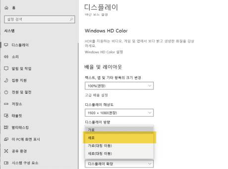 바탕화면 오른쪽 클릭 → 디스플레이 설정 → 디스플레이 방향 → 세로로 변경을 순서로 클릭하면 화면이 세로로 바뀝니다.