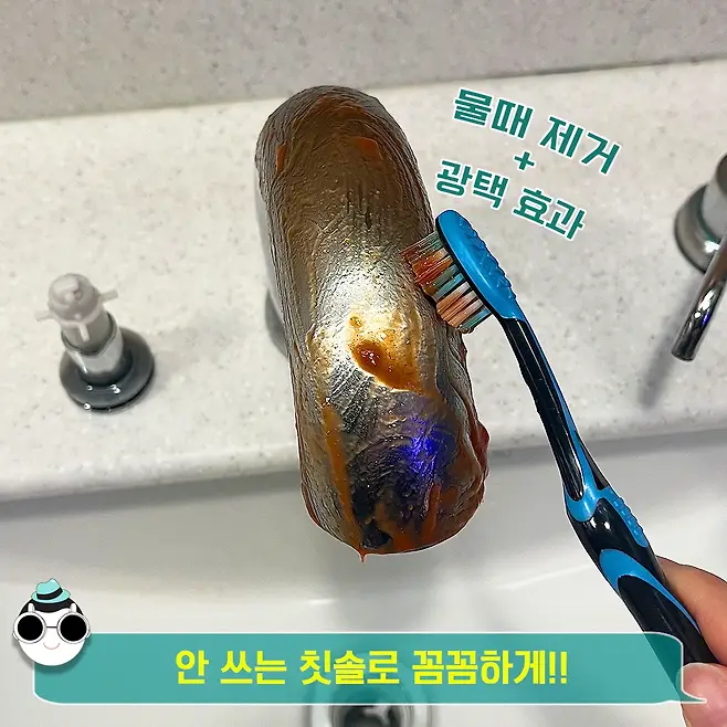 일회용 케첩이나 유통기한 지난 케첩을 세면대 수전에 칫솔로 골고루 잘 발라주세요. 그냥 바르는 것보단 칫솔로 바른다면 손이 닿지 않는 뒤쪽 구석구석까지 발라줄 수 있으니 더 좋을 거예요!|