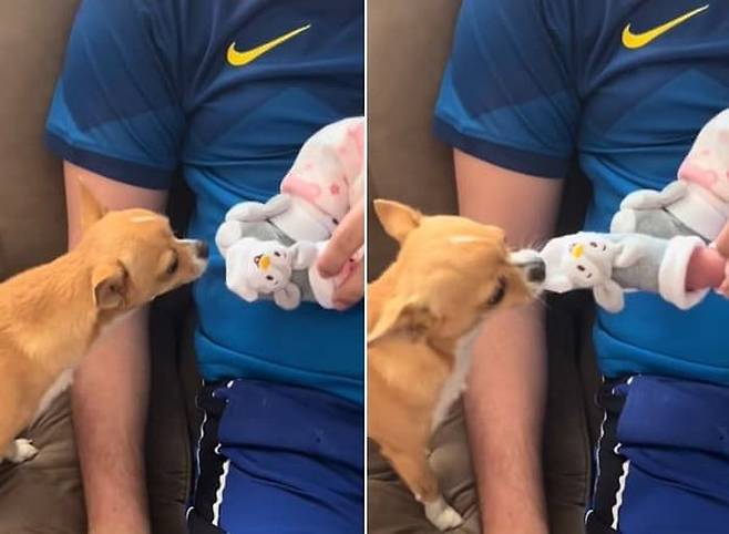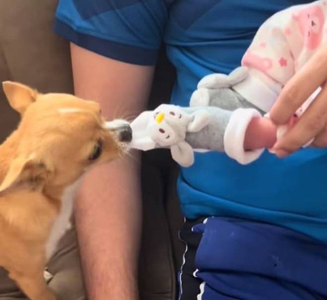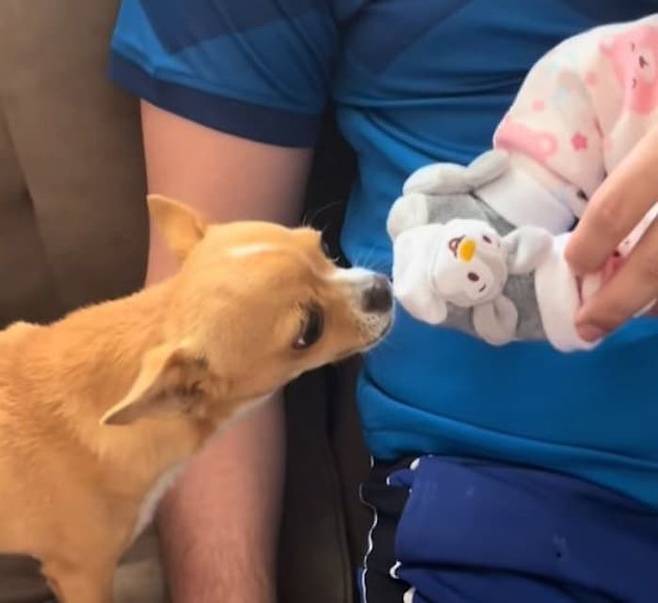 이날 치와와 강아지는 아빠 품에 안겨 있는 아기에게 조심스럽게 가까이 다가갔습니다. 아기는 태어난지 불과 한달도 안된 신생아였는데요.