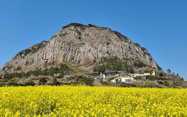 제주에서 가장 인상적인 풍경을 자랑하는 유채꽃 명소 중 하나가 바로 산방산 유채꽃밭입니다. 거대한 바위산인 산방산을 배경으로 넓게 펼쳐진 유채꽃밭은 제주도에서만 볼 수 있는 독특한 풍경을 만들어내는데요.