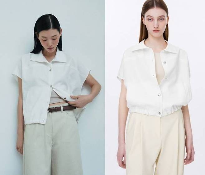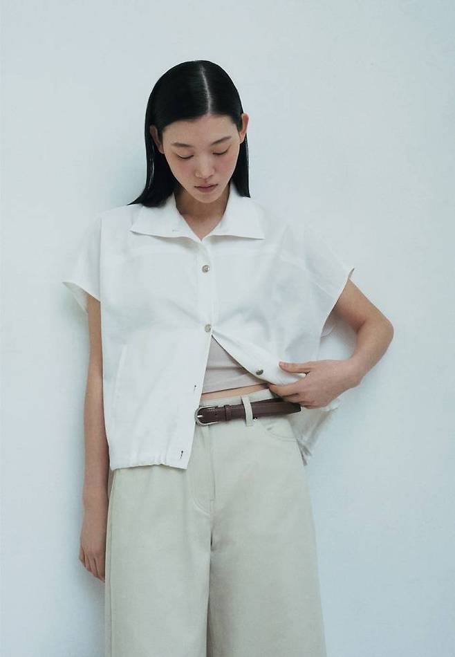 '쉬즈미스'의 화이트 패널 셔츠는 블루종 스타일의 금속 버튼 포인트와 볼륨감 있는 소매가 특징이며 바스락거리는 나일론, 코튼 혼방 소재를 사용해 청량감이 뛰어난 아이템이다.