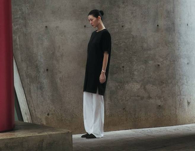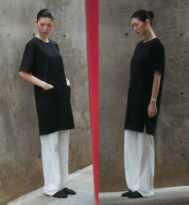'쉬즈미스'의 반팔 블랙 원피스와 화이트 와이드 팬츠 조합은 도회적인 느낌의 시크한 블랙앤화이트룩으로 인기를 끌고 있다.