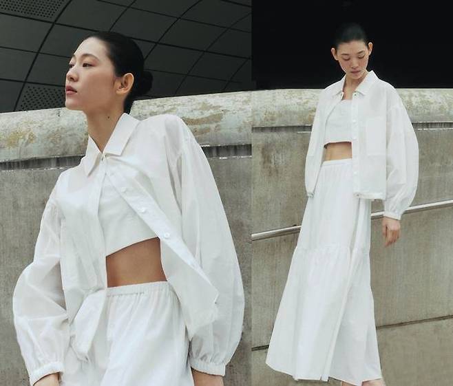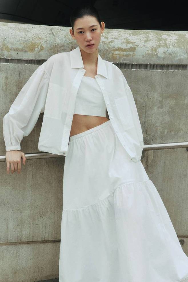 블루종 스타일의 화이트 셔츠와 같은 소재의 셔링 스커트 셋업은 러블리하면서 한여름 경쾌한 데일리룩으로 제격이다.
