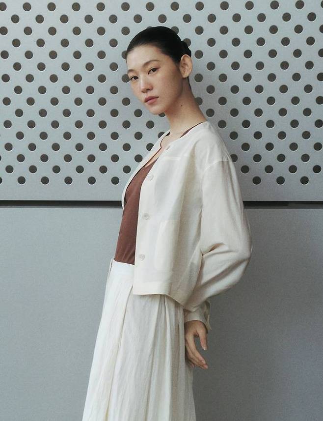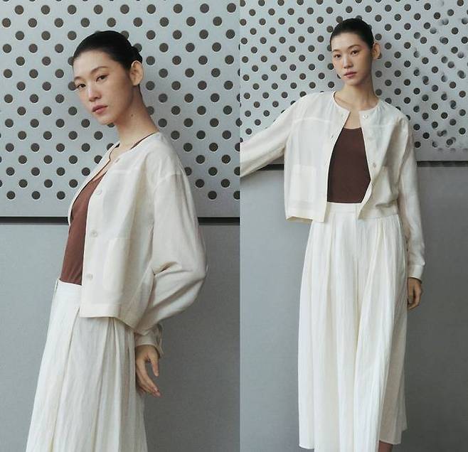 '쉬즈미스' 라운드 넥 재킷은 가벼운 소재감으로 통기성이 뛰어나고 여름 시즌 활용도가 높은 아템으로 같은 소재감의 플리츠 밴딩 스커트와 셋업으로 출시했다.
